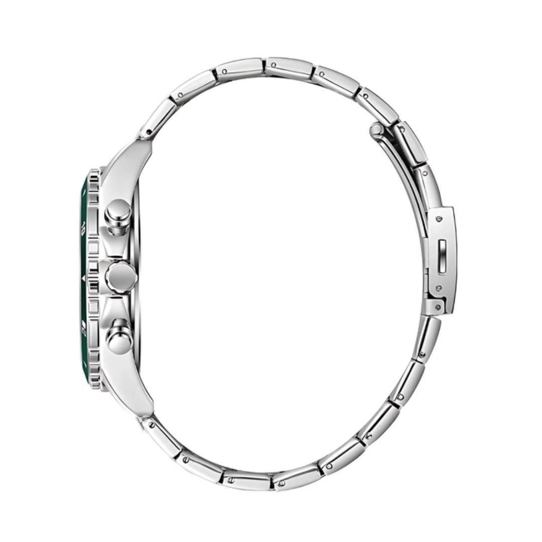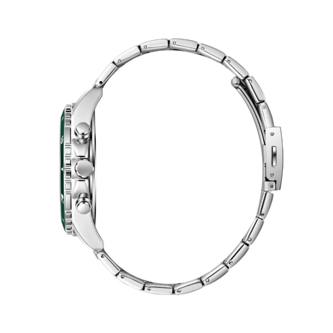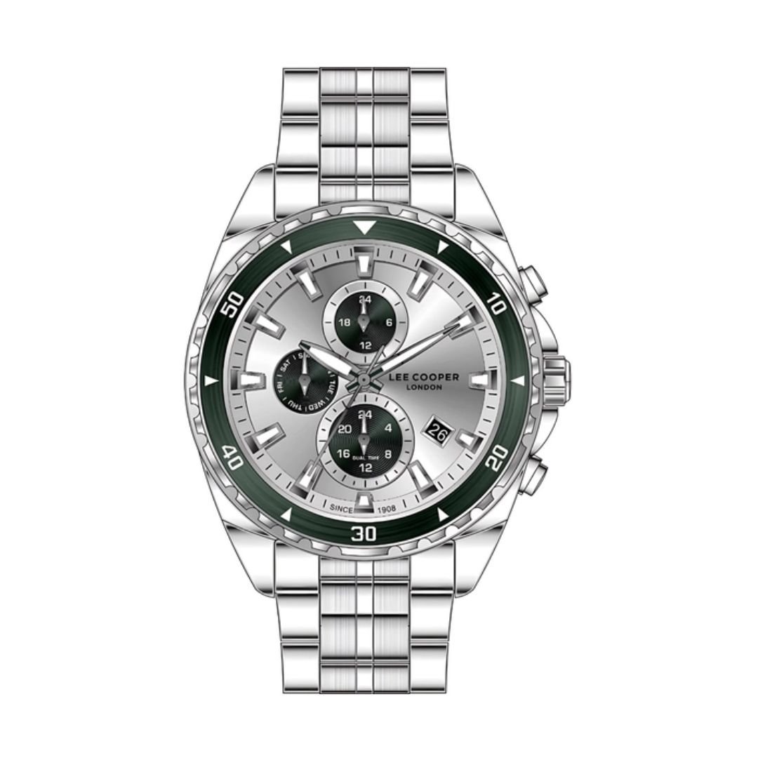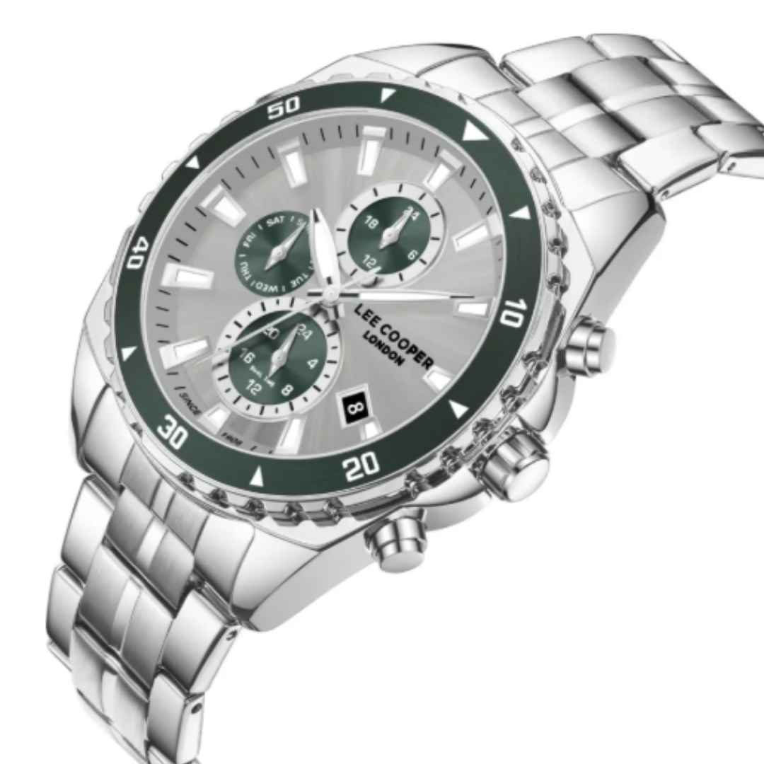 Lee Cooper LC08217.330 นาฬิกาข้อมือผู้ชาย รายละเอียดตัวเครื่องและดีไซน์ • ดีไซน์หน้าปัด: หน้าปัดทรงกลม สีเงิน/เขียว (Silver/Green Dial) แสดงผลแบบมัลติฟังก์ชัน • วัสดุตัวเรือน: ทำจากโลหะผสมพิเศษ Super Metal สีเงิน (Silver Case) • ขนาดตัวเรือน: เส้นผ่านศูนย์กลางหน้าปัด 44 มิลลิเมตร • สายนาฬิกา: สายโลหะ (Metal Bracelet) สีเงิน พร้อมตัวล็อกแบบบานพับ (Clasp) • ระบบการทำงาน: กลไกควอตซ์ญี่ปุ่น (Japanese Quartz) ฟังก์ชัน: แสดงผลแบบมัลติฟังก์ชัน ได้แก่ วันที่ (Date), วันในสัปดาห์ (Day) และเวลาแบบ 24 ชั่วโมง • กระจก: กระจกมิเนอรัล (Mineral Glass) • การกันน้ำ: ระดับ 3 ATM (หรือ 30 เมตร) สามารถทนต่อการล้างมือ หรือฝนตกปรอยๆ ได้ สินค้าของแท้ 100% พร้อมกล่อง นำเข้าและจัดจำหน่ายโดย บริษัท ทีดีซี คอร์ปอเรชั่น จำกัด ** ข้อควรระวัง โดยทั่วไปแล้ว ทนทานต่อการกระเด็นหรือแช่ในน้ำในระยะสั้นๆ แต่ไม่เหมาะสำหรับการใส่ว่ายน้ำหรือใส่อาบน้ำ ** เงื่อนไขการรับประกัน : รับประกันโดย บริษัท ทีดีซี คอร์ปอเรชั่น จำกัด - ส่วนลด 0-50% รับประเครื่องและถ่าน 1 ปี - ส่วนลด 51% ขึ้นไป รับประเครื่องและถ่าน 6 เดือน ** สั่งสินค้าในวัน จันทร์ - พฤหัส ส่งสินค้าวันถัดไป ** สั่งสินค้าในวันศุกร์ ส่งสินค้าวันจันทร์ ** สั่งสินค้า เสาร์-อาทิตย์ ส่งสินค้าวันอังคาร ** ลูกค้าจะได้รับสินค้าหลังจากที่ร้านจัดส่ง 2-5 วันทำการ