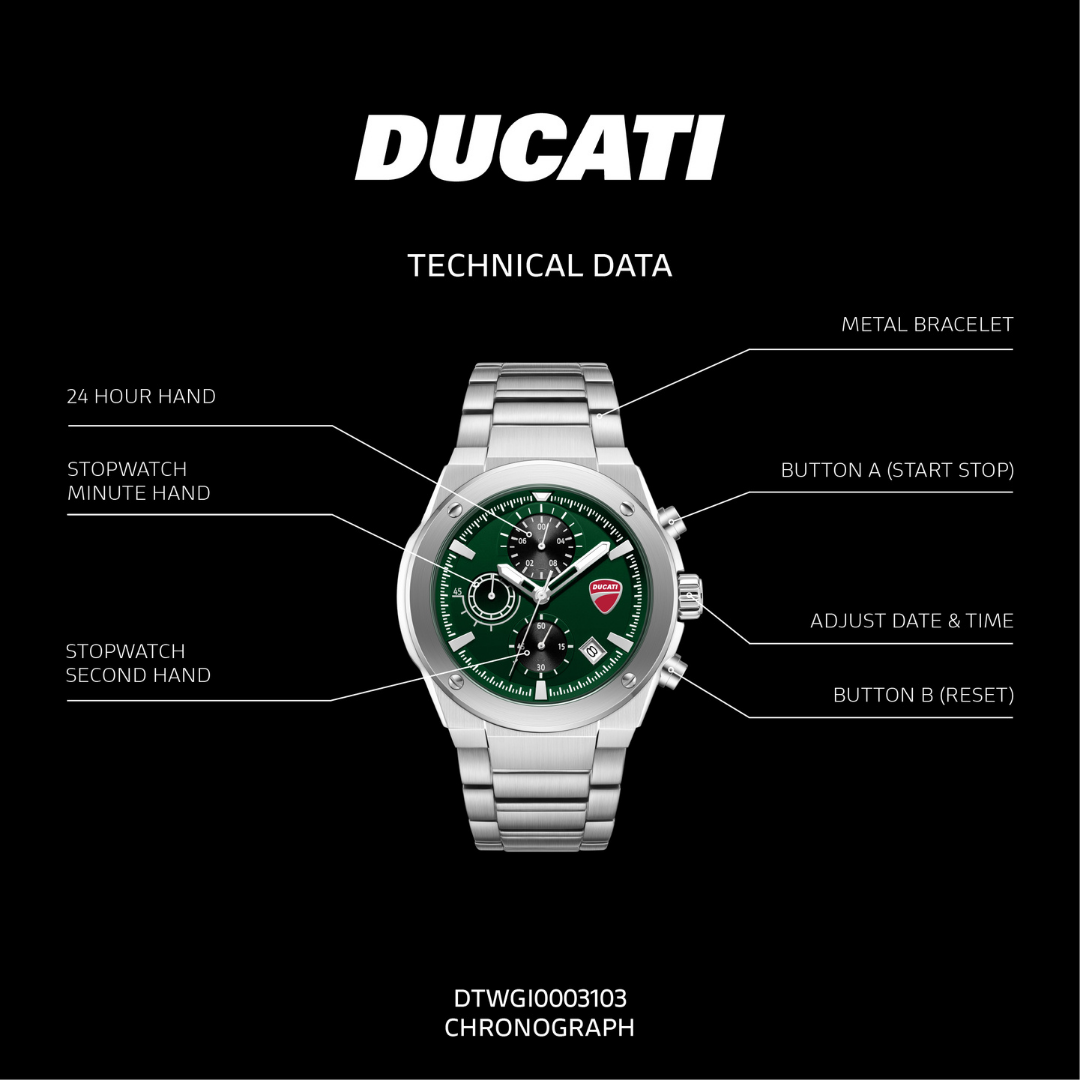 Ducati DTWGI0003103 นาฬิกาข้อมือผู้ชาย • กลไก (Movement): ใช้กลไกควอตซ์จับเวลา (QUARTZ CHRONOGRAPH) • ขนาดตัวเรือน: 42X50.25MM • วัสดุ: ตัวเรือนเป็นสแตนเลสสตีล (SS) ที่มีการขัดแต่งทั้งแบบด้าน (Brushed) และแบบเงา (Polished) รวมถึงปุ่มกดและเม็ดมะยมก็เป็นสแตนเลสเช่นกัน • หน้าปัด: สีเขียว (GREEN) • กระจก: กระจกมิเนอรัล (Mineral Glass) แบบเรียบ (FLAT) ซึ่งทนทานต่อรอยขีดข่วนในระดับการใช้งานทั่วไป • สาย: เป็นสายสแตนเลส (SS BRACELET) ขนาด 26X22MM • การกันน้ำ: ระดับ 5 ATM (กันน้ำได้ 50 เมตร) สามารถใส่อาบน้ำหรือโดนฝนได้ แต่ไม่แนะนำให้ใส่ว่ายน้ำหรือดำน้ำลึก สินค้าของแท้ 100% พร้อมกล่อง นำเข้าและจัดจำหน่ายโดย บริษัท ทีดีซี คอร์ปอเรชั่น จำกัด ** ข้อควรระวัง โดยทั่วไปแล้ว ทนทานต่อการกระเด็นหรือแช่ในน้ำในระยะสั้นๆ แต่ไม่เหมาะสำหรับการใส่ว่ายน้ำหรือใส่อาบน้ำ ** เงื่อนไขการรับประกัน : รับประกันโดย บริษัท ทีดีซี คอร์ปอเรชั่น จำกัด - ส่วนลด 0-50% รับประเครื่องและถ่าน 1 ปี - ส่วนลด 51% ขึ้นไป รับประเครื่องและถ่าน 6 เดือน ** สั่งสินค้าในวัน จันทร์ - พฤหัส ส่งสินค้าวันถัดไป ** สั่งสินค้าในวันศุกร์ ส่งสินค้าวันจันทร์ ** สั่งสินค้า เสาร์-อาทิตย์ ส่งสินค้าวันอังคาร ** ลูกค้าจะได้รับสินค้าหลังจากที่ร้านจัดส่ง 2-5 วันทำการ