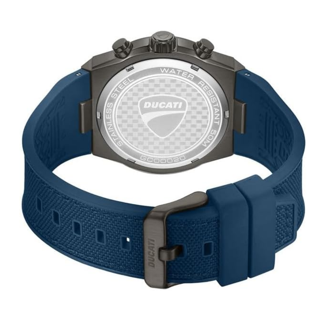 Ducati DTWGC0002002 นาฬิกาข้อมือผู้ชาย • ระบบการทำงาน (MOVT FUNCTION): ควอตซ์ โครโนกราฟ (QUARTZ CHRONOGRAPH), • ขนาดตัวเรือน (CASE SIZE): 41. มม. • ตัวเรือน (CASE): สีกันเมทัล (IP GUN), ตกแต่งแบบเงาและแบบขัดด้าน • ขอบหน้าปัด (TOPRING): สีกันเมทัล (IP GUN) • เม็ดมะยมและปุ่มกด (CROWN & PUSHERS): สีกันเมทัล (IP GUN) • กระจก (MINERAL GLASS): กระจกมิเนอรัลแบบเรียบ (FLAT) • หน้าปัด (DIAL): สีน้ำเงิน • ขนาดสาย (BRACELET/STRAP SIZE): 26 x 20 มม. • สายและตัวล็อก (BRACELET/STRAP & BUCKLE): สายซิลิโคนผสมไนลอนสีน้ำเงิน, เดินด้ายสีเดียวกับสาย (Tonal Stitching), ตัวล็อกสีกันเมทัล (IP GUN) • การกันน้ำ (WR): 5 ATM (กันน้ำลึก 50 เมตร) สินค้าของแท้ 100% พร้อมกล่อง นำเข้าและจัดจำหน่ายโดย บริษัท ทีดีซี คอร์ปอเรชั่น จำกัด ** ข้อควรระวัง โดยทั่วไปแล้ว ทนทานต่อการกระเด็นหรือแช่ในน้ำในระยะสั้นๆ แต่ไม่เหมาะสำหรับการใส่ว่ายน้ำหรือใส่อาบน้ำ ** เงื่อนไขการรับประกัน : รับประกันโดย บริษัท ทีดีซี คอร์ปอเรชั่น จำกัด - ส่วนลด 0-50% รับประเครื่องและถ่าน 1 ปี - ส่วนลด 51% ขึ้นไป รับประเครื่องและถ่าน 6 เดือน ** สั่งสินค้าในวัน จันทร์ - พฤหัส ส่งสินค้าวันถัดไป ** สั่งสินค้าในวันศุกร์ ส่งสินค้าวันจันทร์ ** สั่งสินค้า เสาร์-อาทิตย์ ส่งสินค้าวันอังคาร ** ลูกค้าจะได้รับสินค้าหลังจากที่ร้านจัดส่ง 2-5 วันทำการ