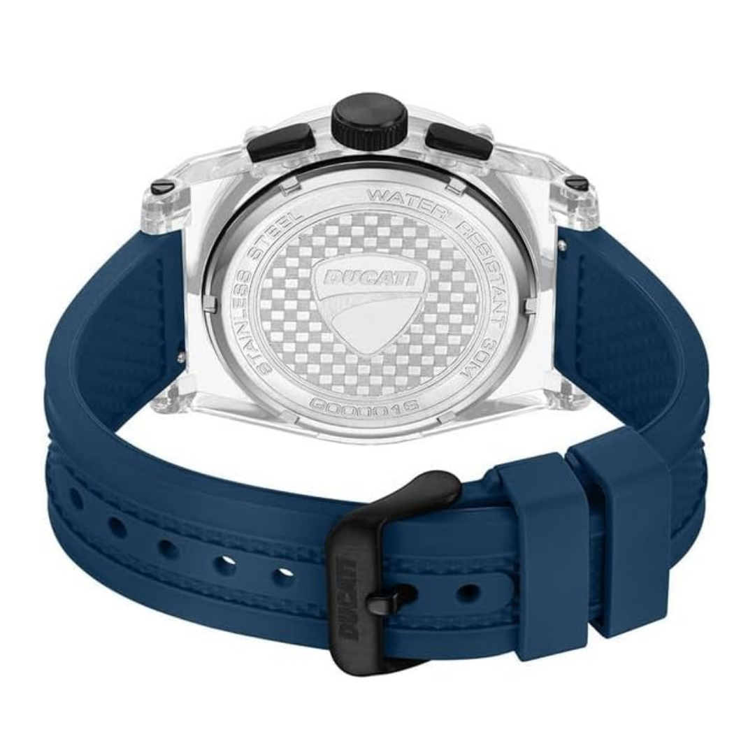 Ducati DTWGO0001602 นาฬิกาข้อมือผู้ชาย • ระบบการทำงาน (MOVT FUNCTION): ควอตซ์ โครโนกราฟ (QUARTZ CHRONOGRAPH), • ขนาดตัวเรือน (CASE SIZE): 43.8 มม. • ตัวเรือน (CASE): แบบโปร่งใส (TRANSPARENT), ตกแต่งแบบเงา • ขอบหน้าปัด (TOPRING): สเตนเลสเคลือบสีดำ (IPB) • เม็ดมะยมและปุ่มกด (CROWN & PUSHERS): สเตนเลสเคลือบสีดำ (IPB) • กระจก (MINERAL GLASS): กระจกมิเนอรัลแบบเรียบ (FLAT) • หน้าปัด (DIAL): สีน้ำเงิน • ขนาดสาย (BRACELET/STRAP SIZE): 22 x 20 มม. • สายและตัวล็อก (BRACELET/STRAP & BUCKLE): สายซิลิโคนสีน้ำเงิน, ตัวล็อกสีดำ (IPB) • การกันน้ำ (WR): 5 ATM (กันน้ำลึก 50 เมตร) สินค้าของแท้ 100% พร้อมกล่อง นำเข้าและจัดจำหน่ายโดย บริษัท ทีดีซี คอร์ปอเรชั่น จำกัด ** ข้อควรระวัง โดยทั่วไปแล้ว ทนทานต่อการกระเด็นหรือแช่ในน้ำในระยะสั้นๆ แต่ไม่เหมาะสำหรับการใส่ว่ายน้ำหรือใส่อาบน้ำ ** เงื่อนไขการรับประกัน : รับประกันโดย บริษัท ทีดีซี คอร์ปอเรชั่น จำกัด - ส่วนลด 0-50% รับประเครื่องและถ่าน 1 ปี - ส่วนลด 51% ขึ้นไป รับประเครื่องและถ่าน 6 เดือน ** สั่งสินค้าในวัน จันทร์ - พฤหัส ส่งสินค้าวันถัดไป ** สั่งสินค้าในวันศุกร์ ส่งสินค้าวันจันทร์ ** สั่งสินค้า เสาร์-อาทิตย์ ส่งสินค้าวันอังคาร ** ลูกค้าจะได้รับสินค้าหลังจากที่ร้านจัดส่ง 2-5 วันทำการ