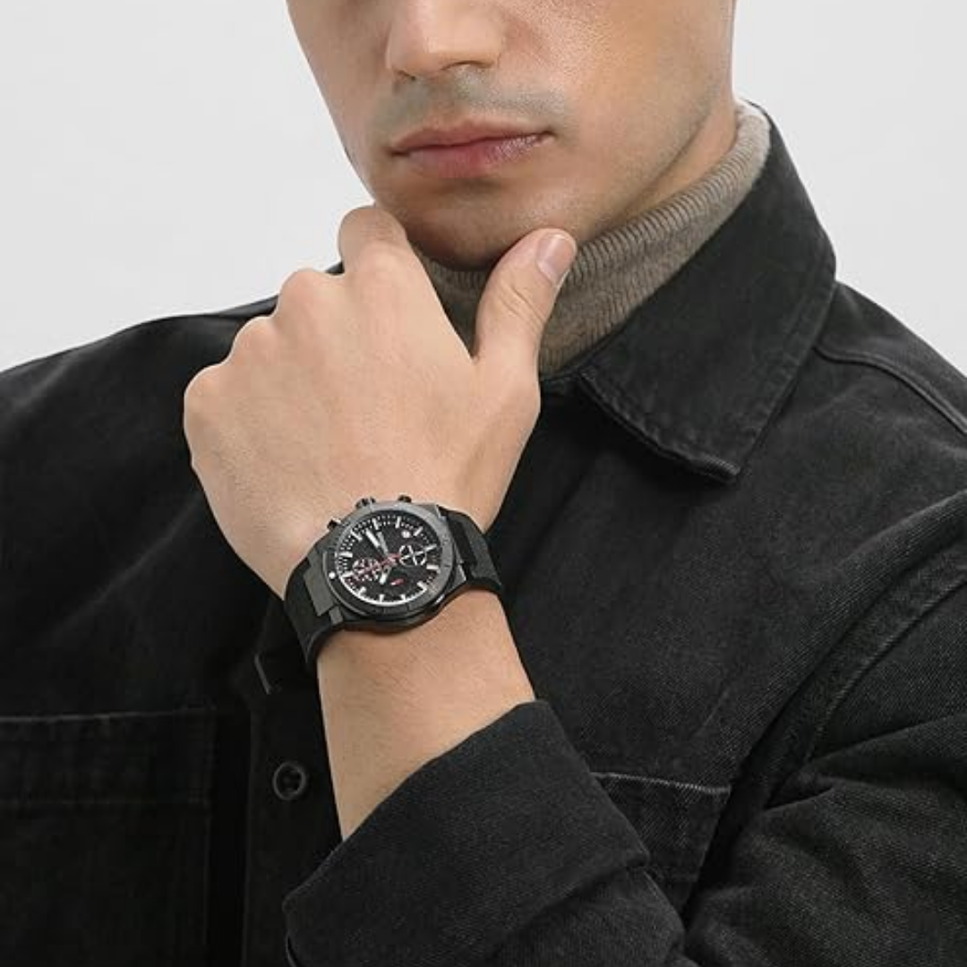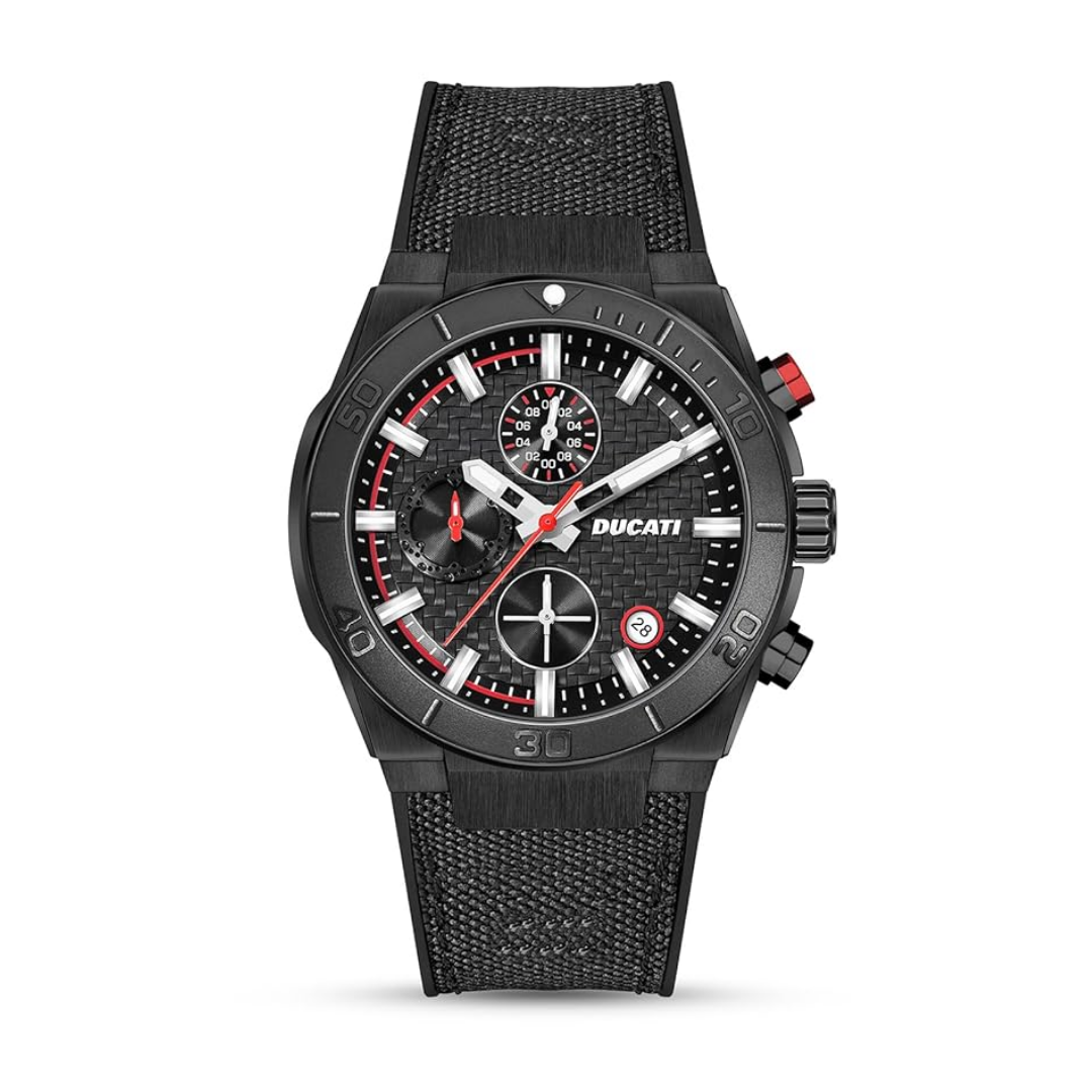 Ducati DTWGO0001201 นาฬิกาข้อมือผู้ชาย • ระบบการทำงาน (MOVT FUNCTION): โครโนกราฟ (CHRONOGRAPH), • ขนาดตัวเรือน (CASE SIZE): 43.5 มม. • ตัวเรือน (CASE): สเตนเลสเคลือบสีดำ (IPB), ตกแต่งแบบเงาและแบบขัดด้าน • ขอบหน้าปัด (TOPRING): อลูมิเนียมสีดำ (BLACK ALUMINUM) • เม็ดมะยมและปุ่มกด (CROWN & PUSHERS): สีดำ (IPB) และ สีดำ/แดง (IPB/RED) • กระจก (MINERAL GLASS): กระจกมิเนอรัลแบบเรียบ (FLAT) • หน้าปัด (DIAL): สีดำ/แดง ผสมกับสเตนเลสสตีลและสีขาว • ขนาดสาย (BRACELET/STRAP SIZE): 26 x 22 มม. • สายและตัวล็อก (BRACELET/STRAP & BUCKLE): สายไนลอนสีดำผสมซิลิโคน, ตัวล็อกแบบธรรมดาสีดำ (IPB) • การกันน้ำ (WR): 5 ATM (กันน้ำลึก 50 เมตร) สินค้าของแท้ 100% พร้อมกล่อง นำเข้าและจัดจำหน่ายโดย บริษัท ทีดีซี คอร์ปอเรชั่น จำกัด ** ข้อควรระวัง โดยทั่วไปแล้ว ทนทานต่อการกระเด็นหรือแช่ในน้ำในระยะสั้นๆ แต่ไม่เหมาะสำหรับการใส่ว่ายน้ำหรือใส่อาบน้ำ ** เงื่อนไขการรับประกัน : รับประกันโดย บริษัท ทีดีซี คอร์ปอเรชั่น จำกัด - ส่วนลด 0-50% รับประเครื่องและถ่าน 1 ปี - ส่วนลด 51% ขึ้นไป รับประเครื่องและถ่าน 6 เดือน ** สั่งสินค้าในวัน จันทร์ - พฤหัส ส่งสินค้าวันถัดไป ** สั่งสินค้าในวันศุกร์ ส่งสินค้าวันจันทร์ ** สั่งสินค้า เสาร์-อาทิตย์ ส่งสินค้าวันอังคาร ** ลูกค้าจะได้รับสินค้าหลังจากที่ร้านจัดส่ง 2-5 วันทำการ