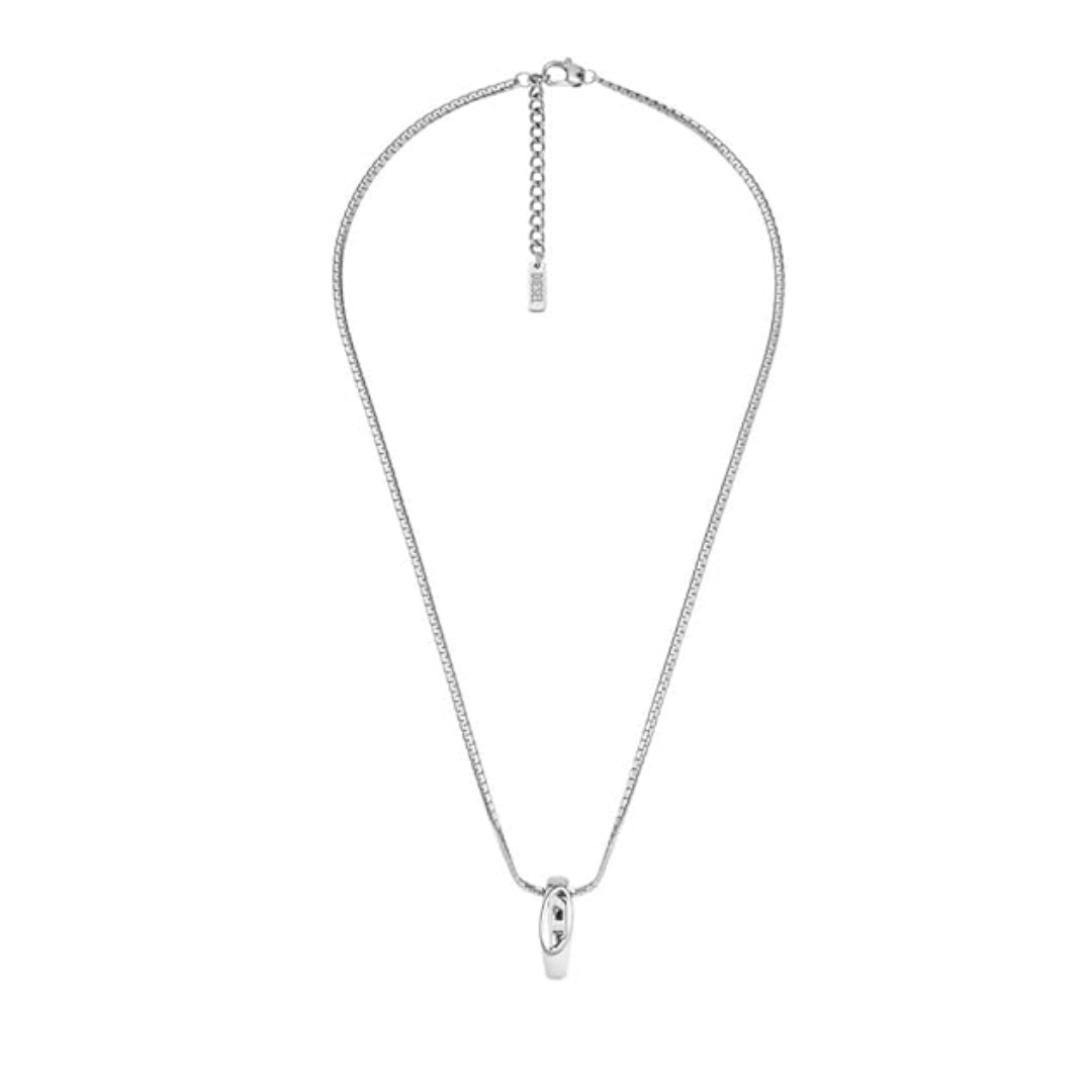 สร้อยคอสีเงินของ Diesel โดดเด่นด้วยสแตนเลสสตีลและจี้รูปแหวนพร้อมโลโก้รูปวงรี D ตกแต่งด้วยตัวล็อกแบบก้ามกุ้ง