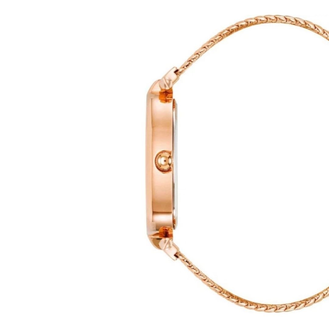 • สายนาฬิกา: สายโลหะแบบตาข่าย (mesh bracelet) ผลิตจากสเตนเลสสตีลสีโรสโกลด์ พร้อมตัวล็อกแบบจิวเวลรี่ (jewelry clasp)