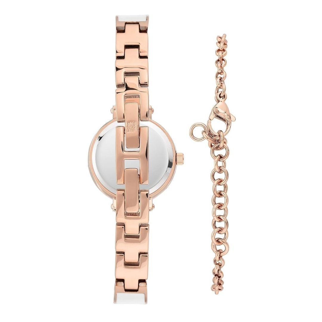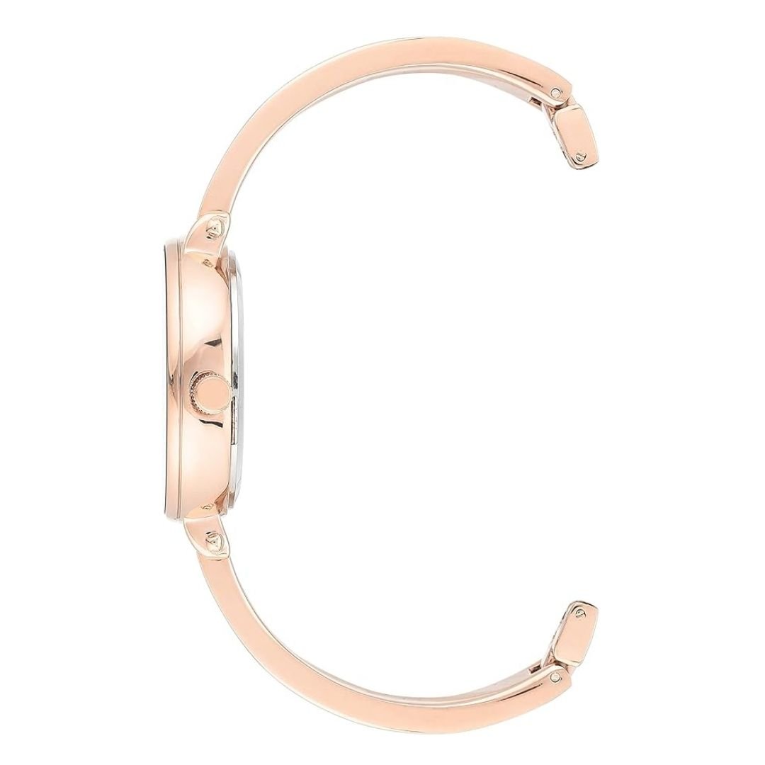 • สายนาฬิกา: สายโลหะแบบกำไล (bangle) สีโรสโกลด์ (enamel filling) สีขาว มีข้อต่อที่ปรับขนาดได้ (adjustable end links) และตัวล็อกแบบจิวเวลรี่ (jewelry clasp)