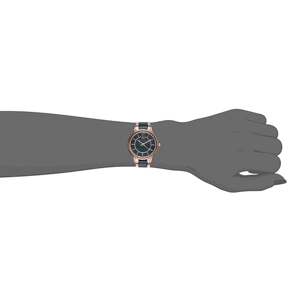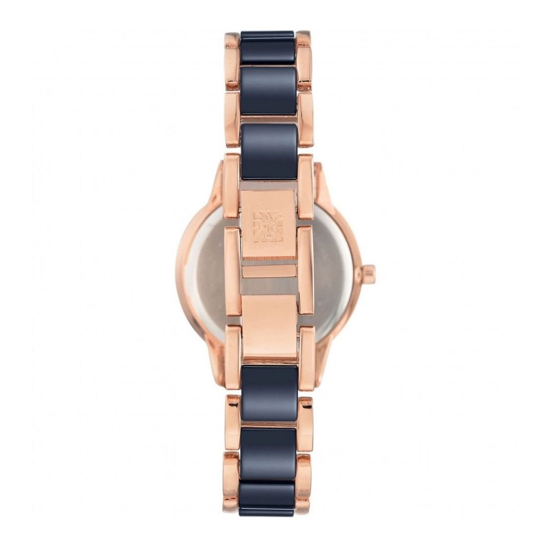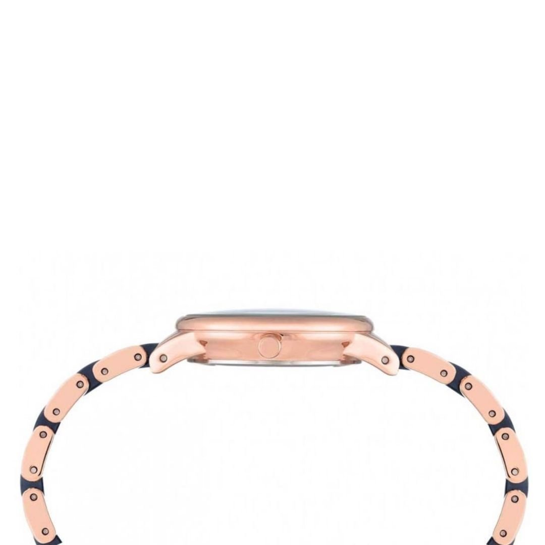 • สายนาฬิกา: สายข้อมือแบบข้อต่อปรับได้ (adjustable link bracelet) ผลิตจากเซรามิกสีน้ำเงินกรมท่า พร้อมขอบโลหะสีโรสโกลด์ และตัวล็อกแบบจิวเวลรี่ (jewelry clasp)