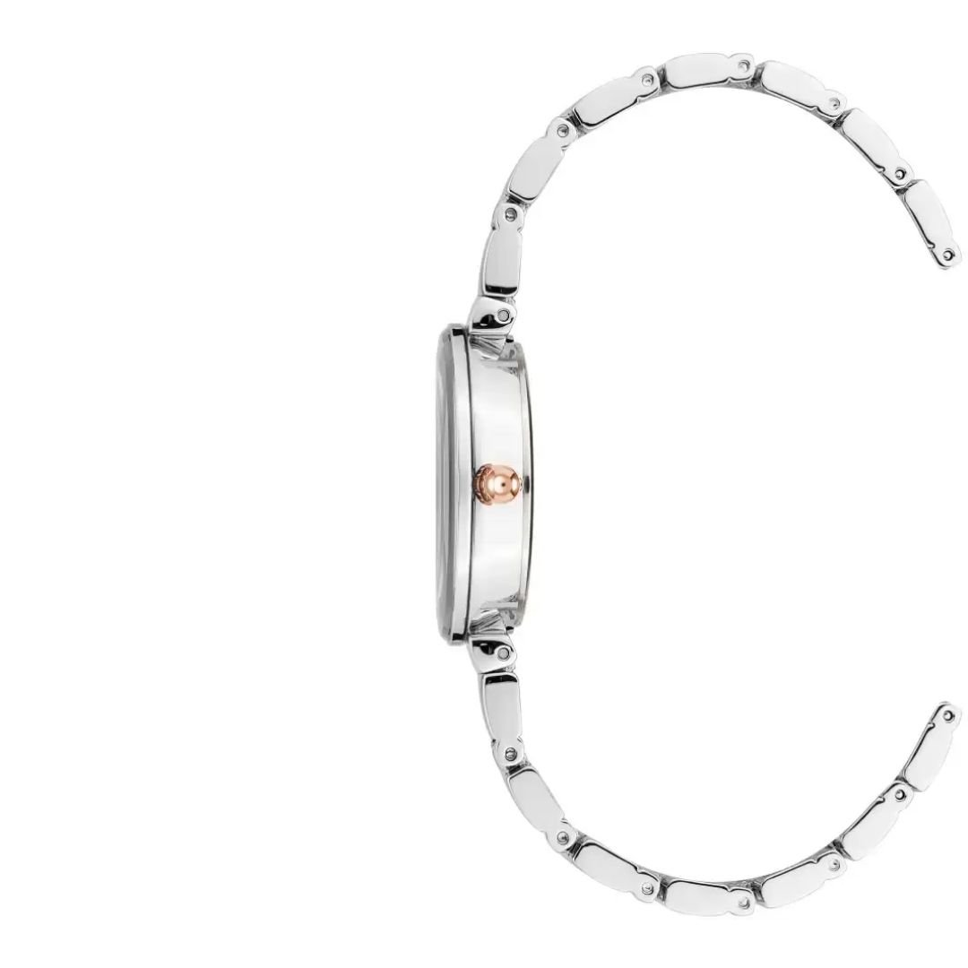 • สายนาฬิกา: สายโลหะแบบข้อต่อปรับได้ (adjustable link bracelet) สีโรสโกลด์ พร้อมตัวล็อกแบบจิวเวลรี่ (jewelry clasp)
