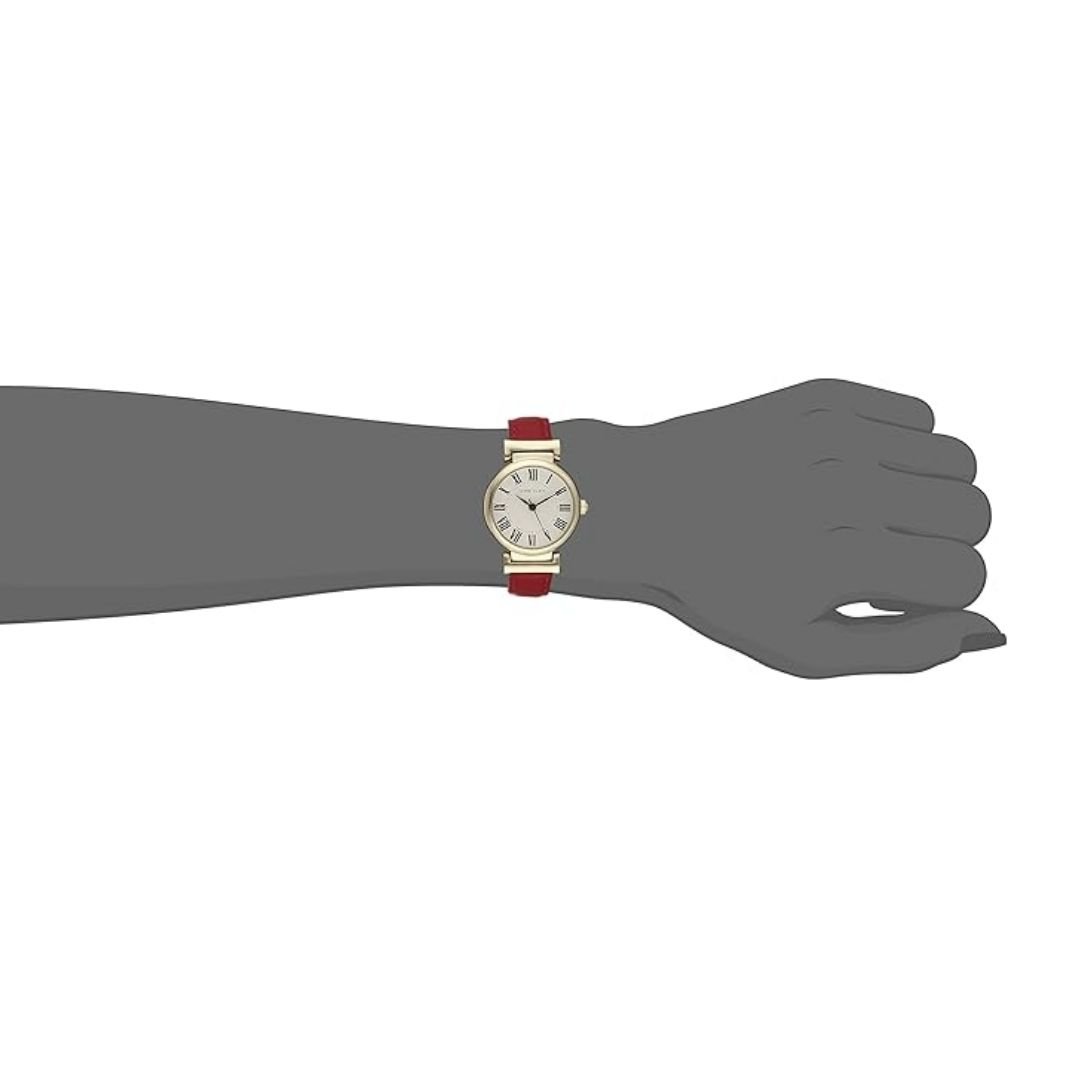 • สายนาฬิกา: สายหนังแท้สีแดง (red leather strap) พร้อมตัวล็อกแบบหัวเข็มขัด (buckle closure)
