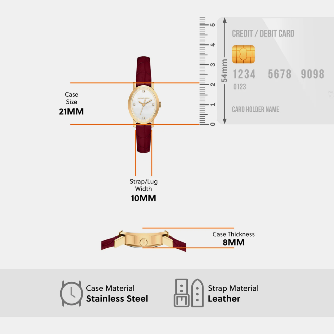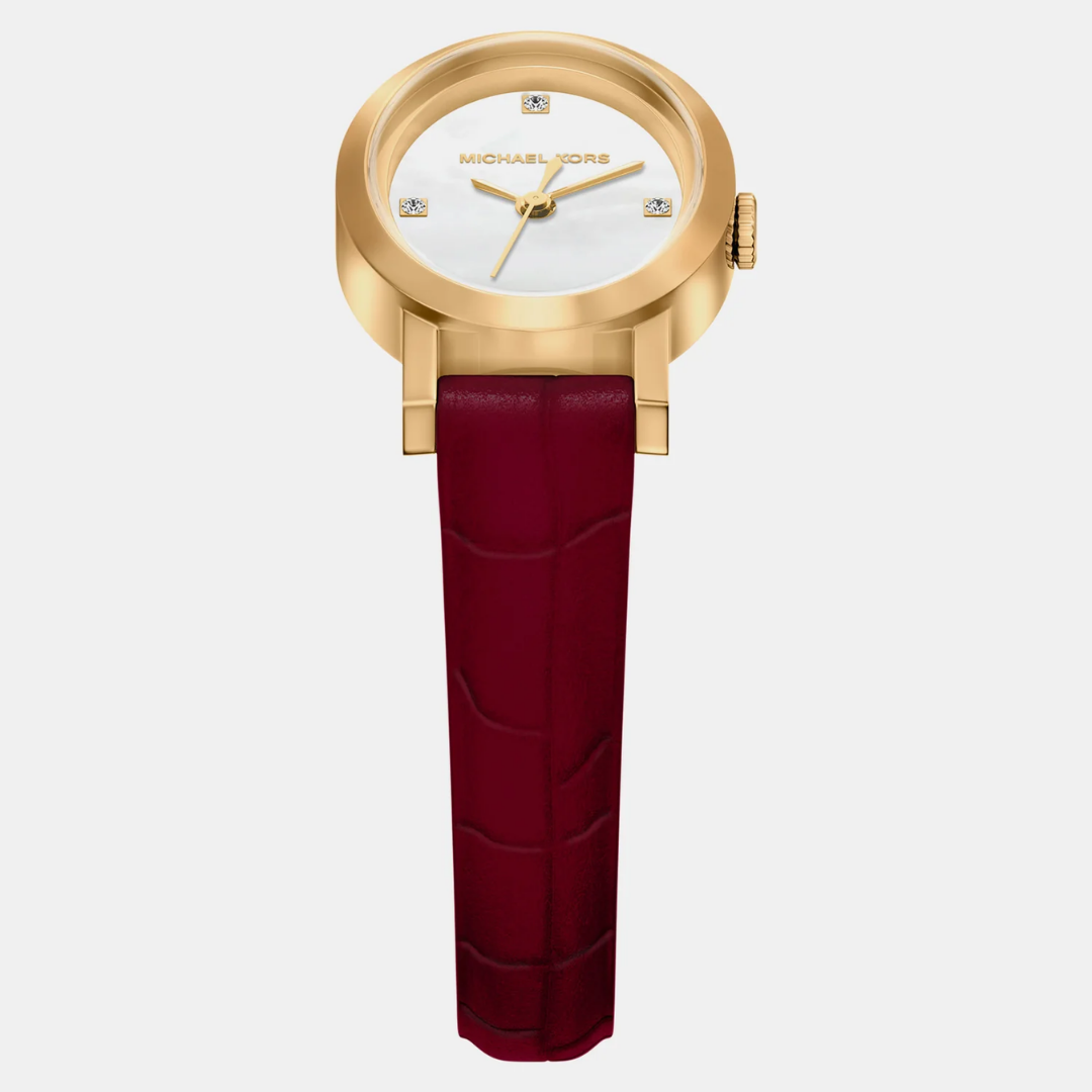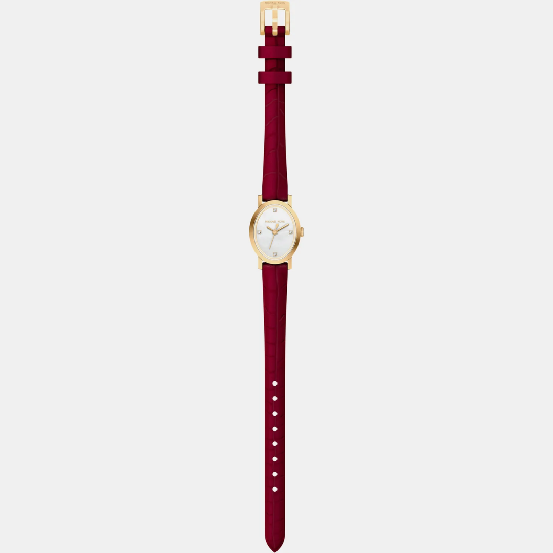 • ดีไซน์: ทรงรี (Oval) สุดคลาสสิก ตัวเรือนสีทองตัดกับสายหนังสีแดงเบอร์กันดี ให้ลุคที่ดูภูมิฐานและทรงพลัง