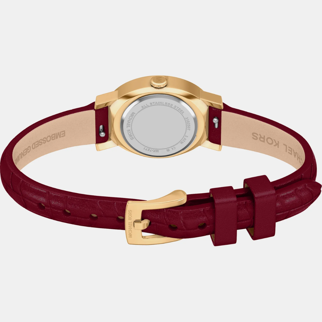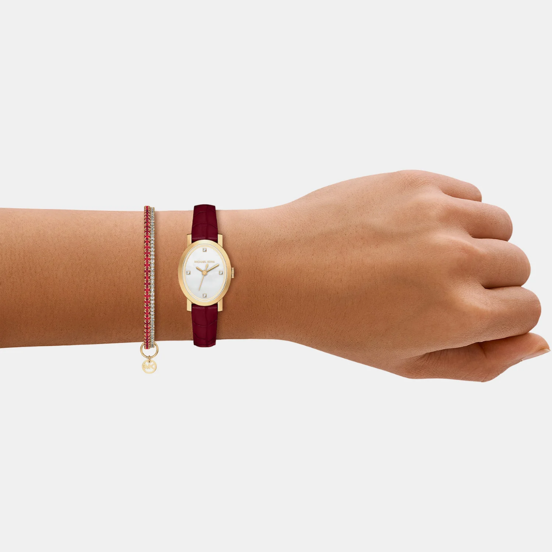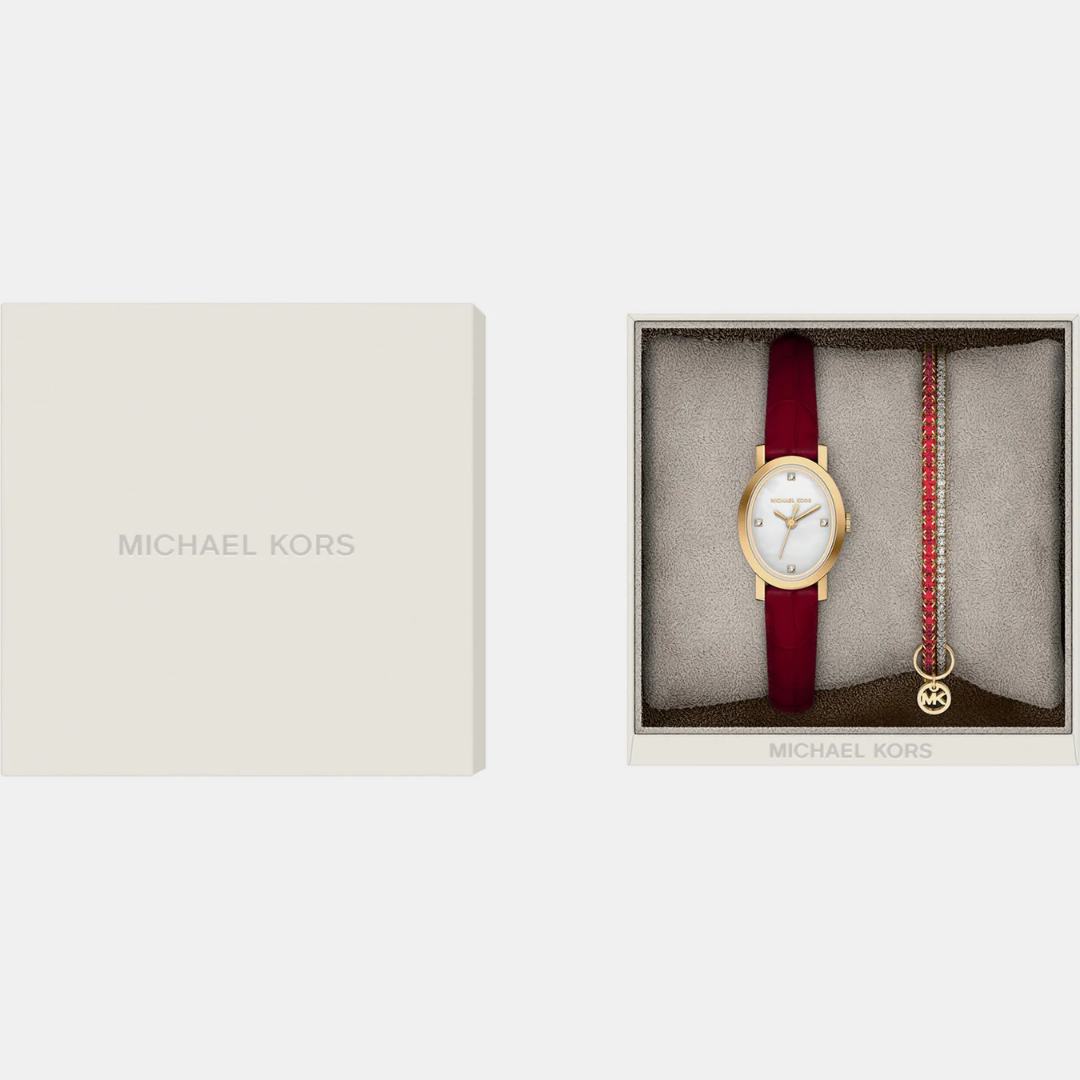 • สินค้าในเซต: นาฬิกาข้อมือรุ่น Maude 1 เรือน พร้อม สร้อยข้อมือประดับคริสตัลสีแดง-ขาว และจี้โลโก้ MK