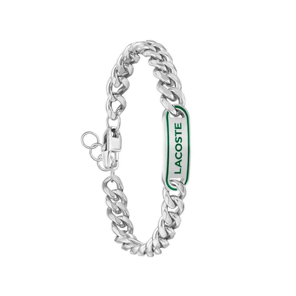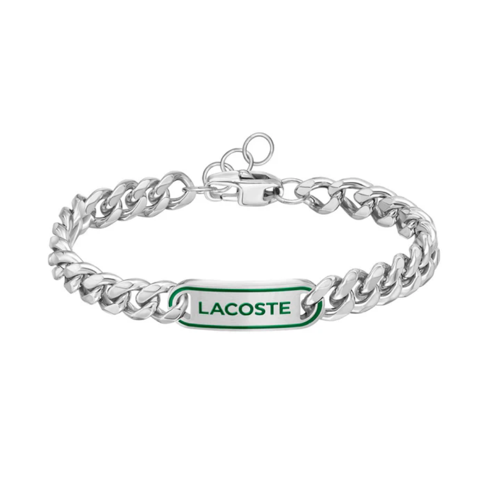 • ดีไซน์: เป็นสร้อยข้อมือแบบ โซ่ถัก (Chain Bracelet) มาพร้อมแผ่นป้ายโลโก้สลักชื่อแบรนด์ "LACOSTE" สีเขียว ล้อมรอบด้วยเส้นขอบสีเขียวที่เป็นซิกเนเจอร์ของแบรนด์